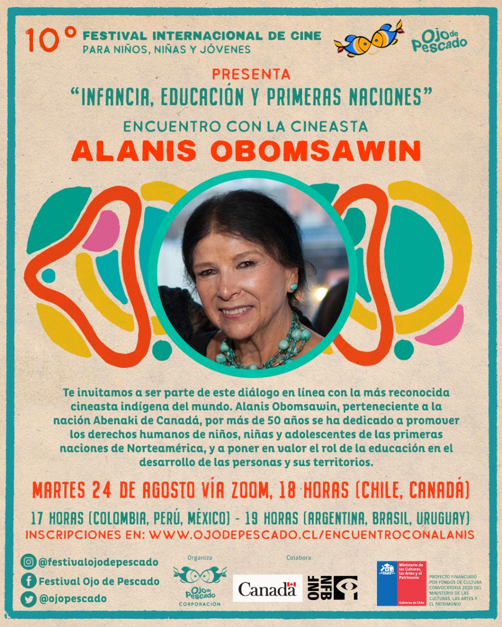 Hoy martes 24 de agosto, a las 18:00 horas, el Festival Ojo de Pescado llevará a cabo un Encuentro en línea con la cineasta Abenaki canadiense Alanis Obomsawin, considerada la más importante cineasta indígena del mundo. Ella tiene 89 años y lleva 50 años realizando películas sobre los derechos de los niños y niñas de las primeras naciones de Canadá, un conjunto de películas conmovedoras que nos hablan del colonialismo y la deuda histórica que tenemos en el mundo con las infancias y las primeras naciones. Es realmente imperdible.